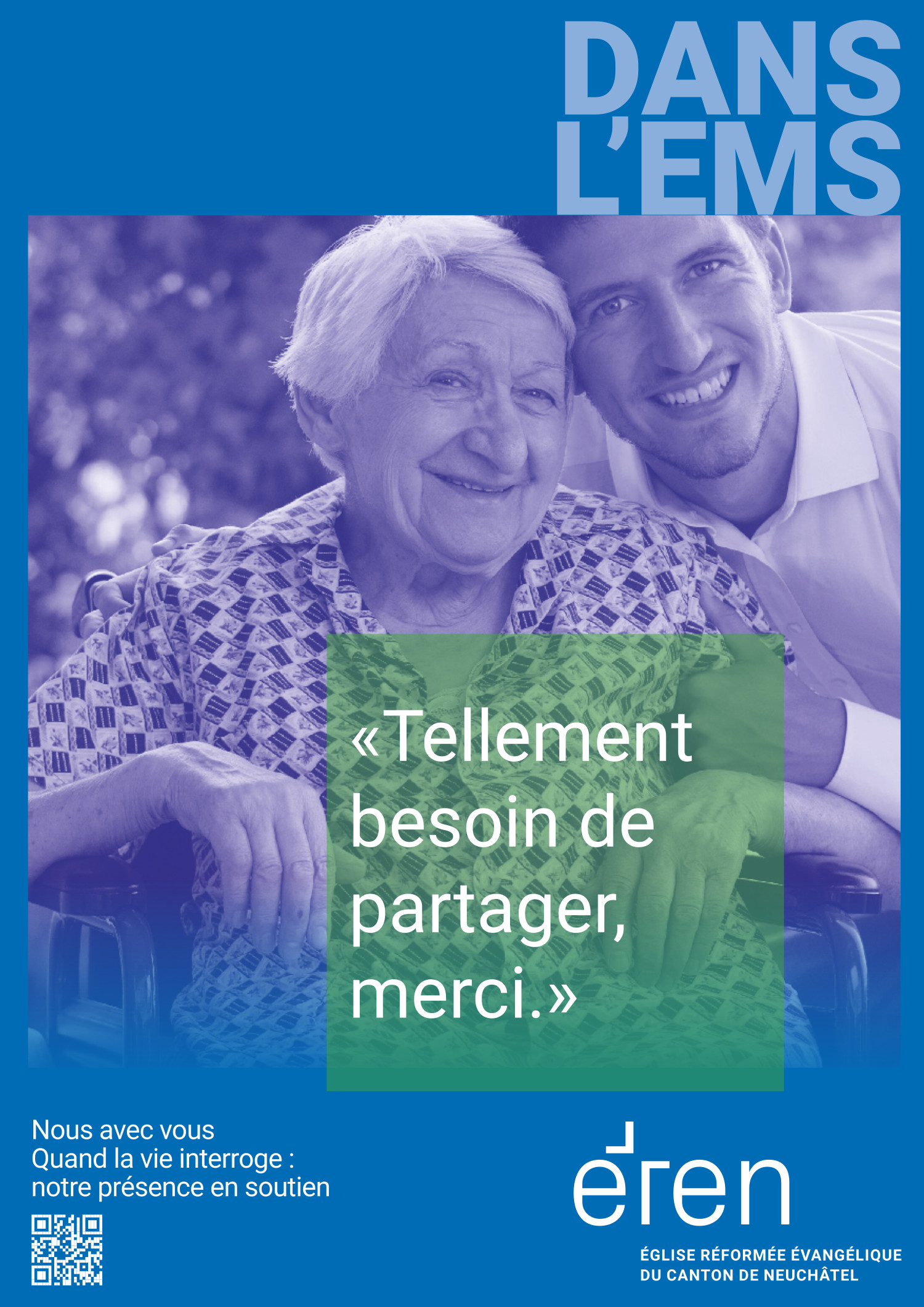 Rentrer dans un EMS (établissement médico-social) constitue souvent un moment difficile pour une personne. Les aumôniers vont à la rencontre de tout un chacun, dans le respect des convictions et sans aucune tentative de prosélytisme, tout en collaborant étroitement avec le personnel et des bénévoles. Ils offrent régulièrement aux résidents qui le souhaitent la possibilité de participer à un culte dans leur institution.