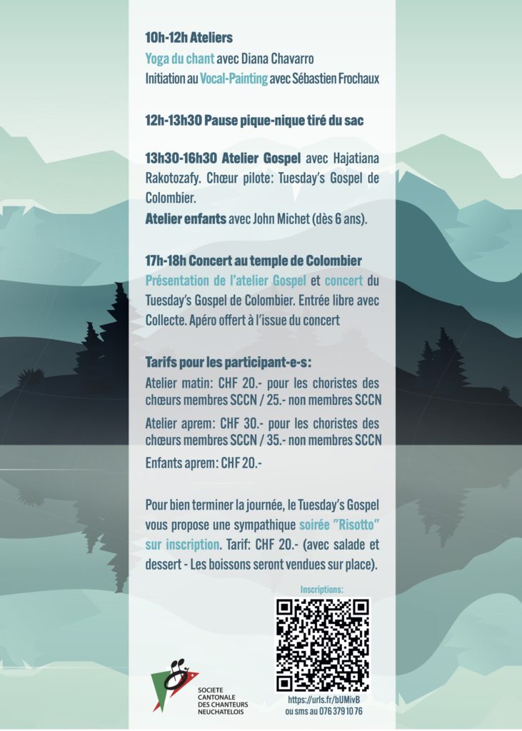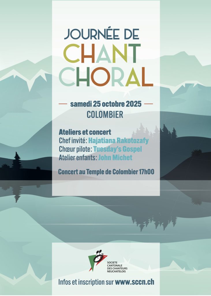 La société cantonale des chanteurs neuchâtelois SCCN organise le 25 octobre 2025 une journée de chant choral au temple de Colombier.