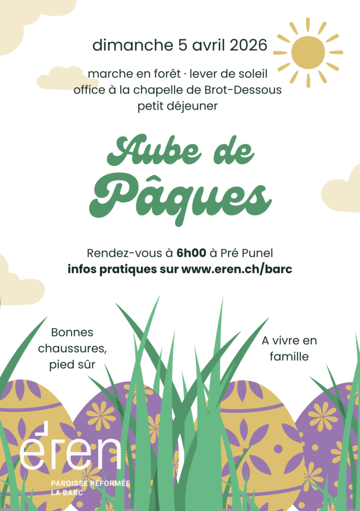Connaissez-vous la très jolie chapelle de Brot-Dessous? Vous passez à côté lorsque vous vous rendez au Val-de-Travers mais y avez-vous déjà pénétré? Le matin du jour de Pâques, 5 avril 2026, nous vous proposons une marche en forêt qui débutera dans la nuit. Petit à petit le jour se lèvera et avec lui, grandira l’espérance de la Résurrection. Nos pas nous conduirons jusqu’à la chapelle pour un temps de célébration et de petit-déjeuner.
