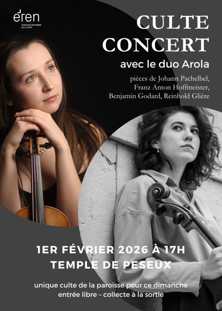 Le prochain culte concert aura lieu avec le duo Arola : Alla Ternova (violon) et Zoya Sudnis (violoncelle). Des œuvres de Pachelbel, Hoffmeister, Benjamin Godard, Reinhold Glière ponctueront la célébration.