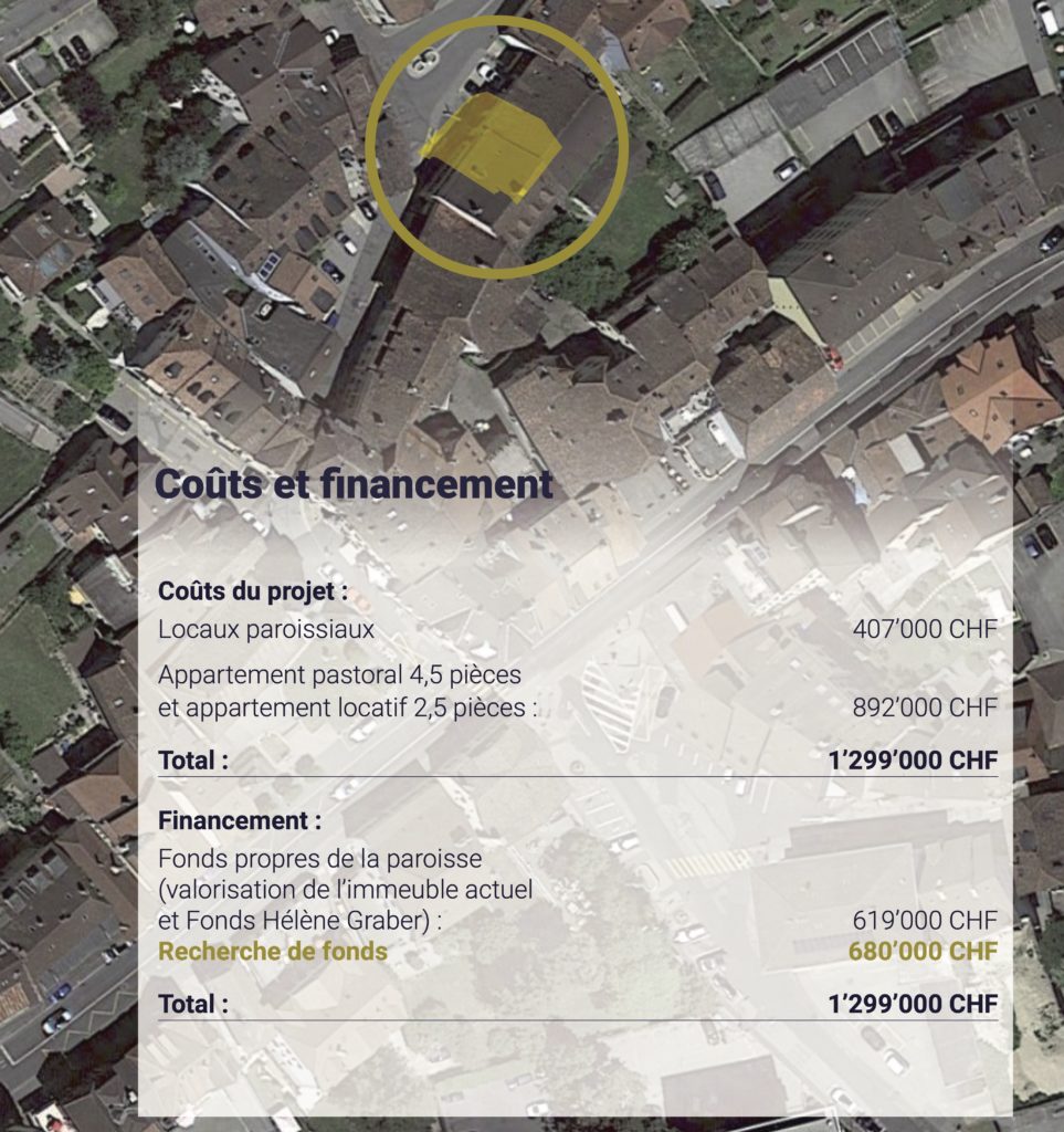 Stationnement : de nombreuses places en zone bleue se trouvent au parking de la Migros (à env. 300 m de la Maison de paroisse, soit 5 minutes à pied – itinéraire)