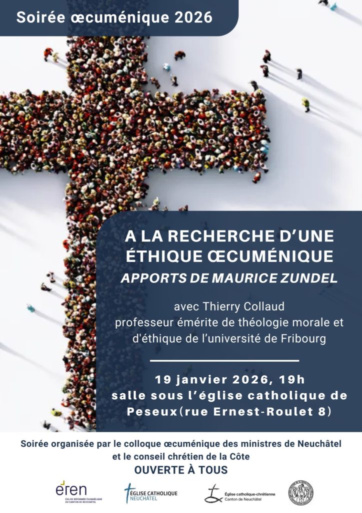La Soirée œcuménique sera organisée cette année conjointement par le Conseil chrétien de la Côte et le colloque œcuménique des ministres de Neuchâtel. Elle portera sur la question d’une éthique chrétienne cherchant à dépasser les clivages que peuvent engendrer les différentes confessions.