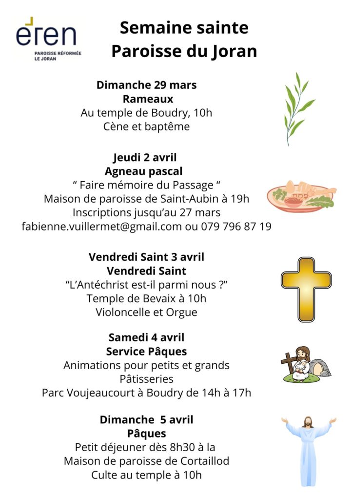 | Dimanche 12 avril Cène | 10h | Temple de Boudry | Daniel Landry |