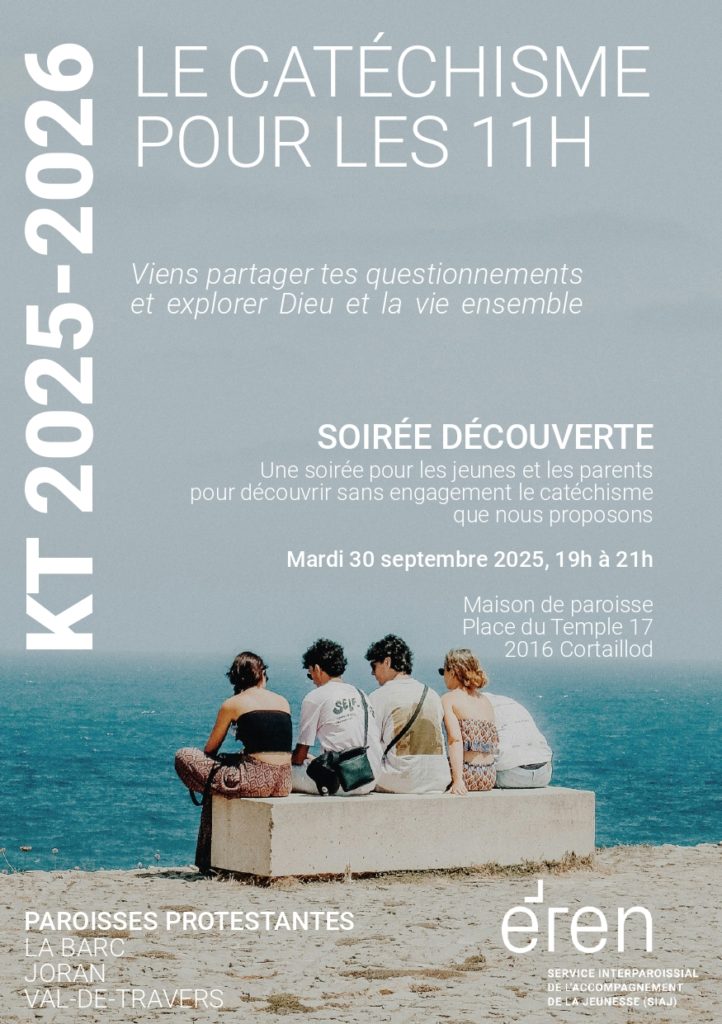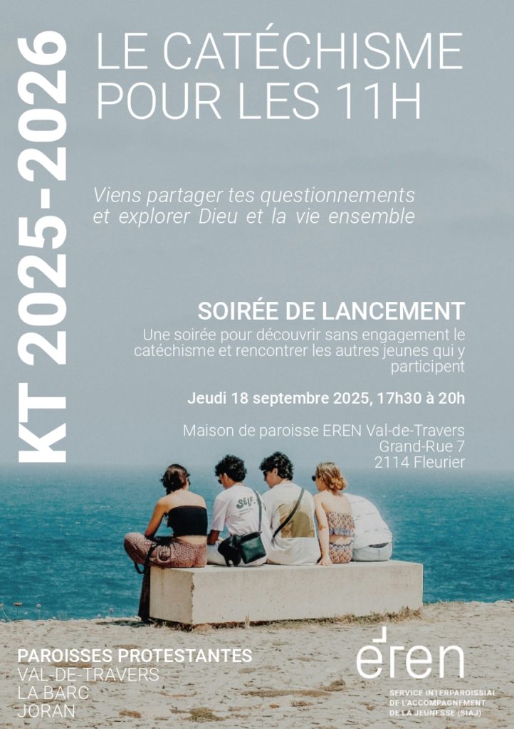 Les paroisses de La BARC, du Joran et de Val-de-Travers sont heureuses de proposer aux jeunes de 11H un tel catéchisme. Animé par des jeunes, le KT permet aux ados de confronter leurs idées et leurs questionnements, d’aborder des sujets importants sous un angle différent, de s’ouvrir à la spiritualité et de développer des compétences humaines de vivre-ensemble dans un cadre ouvert, respectueux de chacun·e et convivial.
