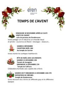 | Dimanche 30 novembre | Salle de paroisse Dombresson, petite vente de l’Avent | |