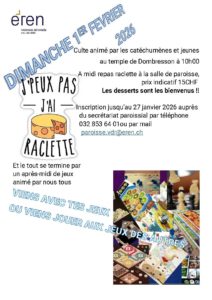 | Dimanche 1er février | 10h00 | Culte à Dombresson, Isabelle Hervé et Esther Berger |