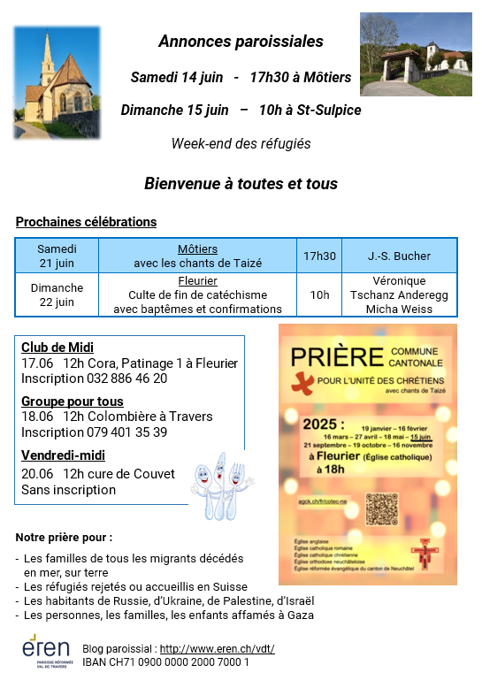 La paroisse protestante réformée du Val-de-Travers est une paroisse de l’EREN. Elle couvre les communes de Val-de-Travers, de La Côte-aux-Fées et des Verrières. Elle est un lieu d’ouverture, qui souhaite offrir aux habitant·e·s et aux gens de passage un espace à la rencontre de Dieu et des autres, dans la liberté. Bienvenue !