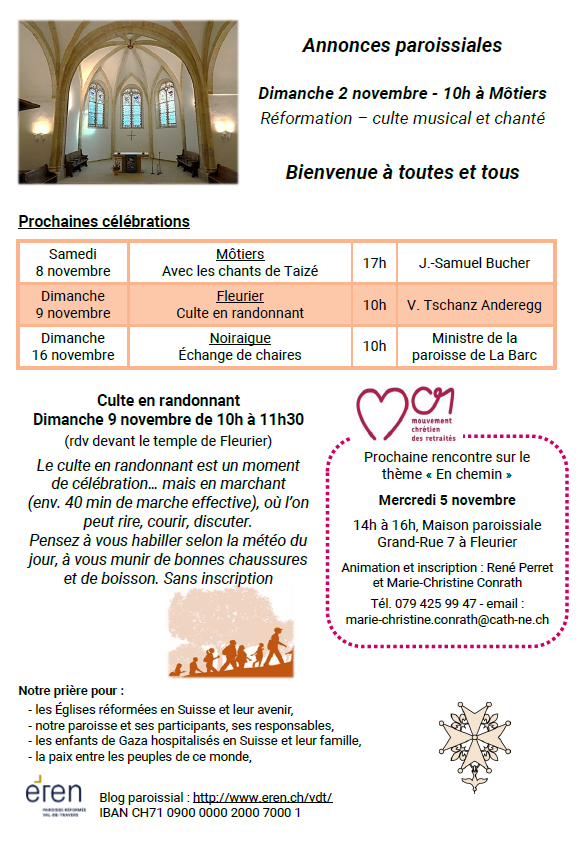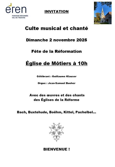 La paroisse protestante réformée du Val-de-Travers est une paroisse de l’EREN. Elle couvre les communes de Val-de-Travers, de La Côte-aux-Fées et des Verrières. Elle est un lieu d’ouverture, qui souhaite offrir aux habitant.e.s et aux gens de passage un espace à la rencontre de Dieu et des autres, dans la liberté. Bienvenue !