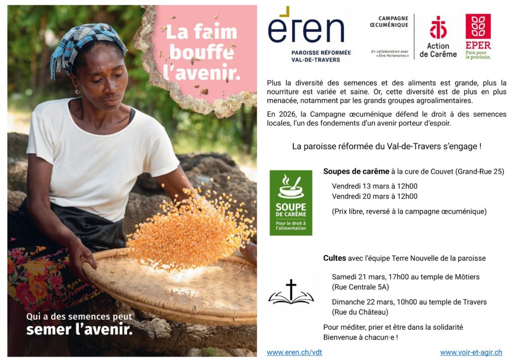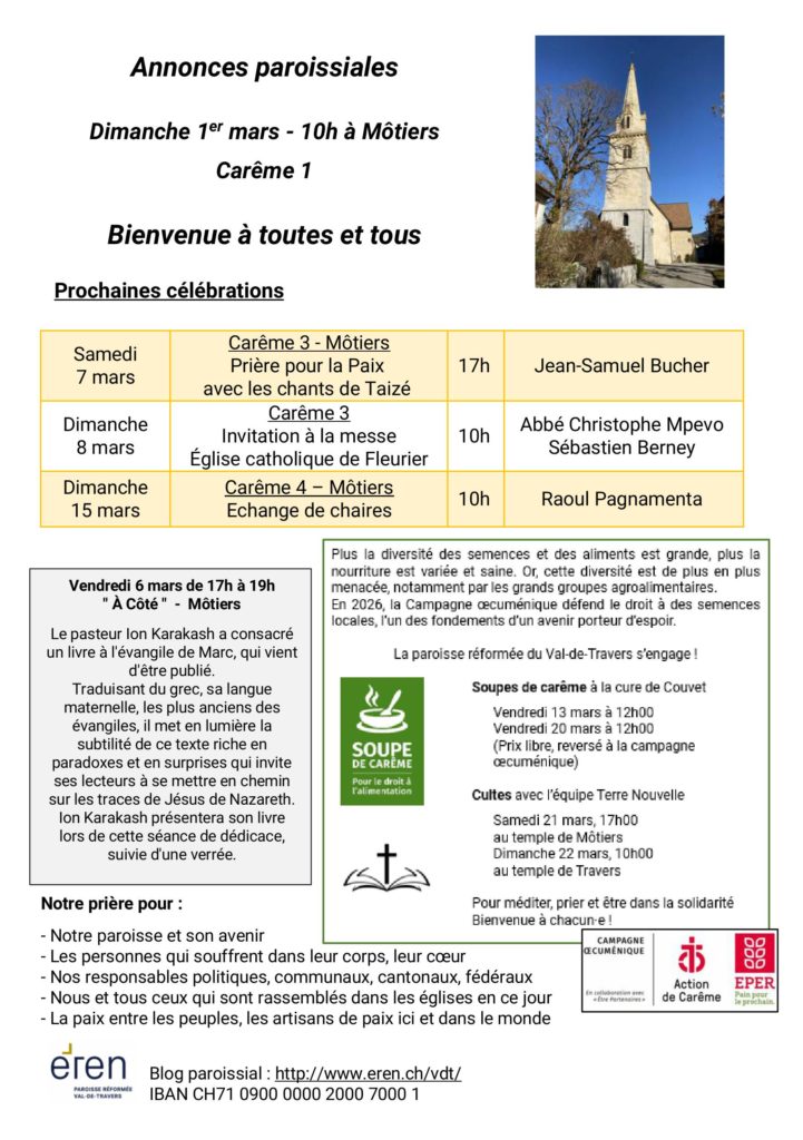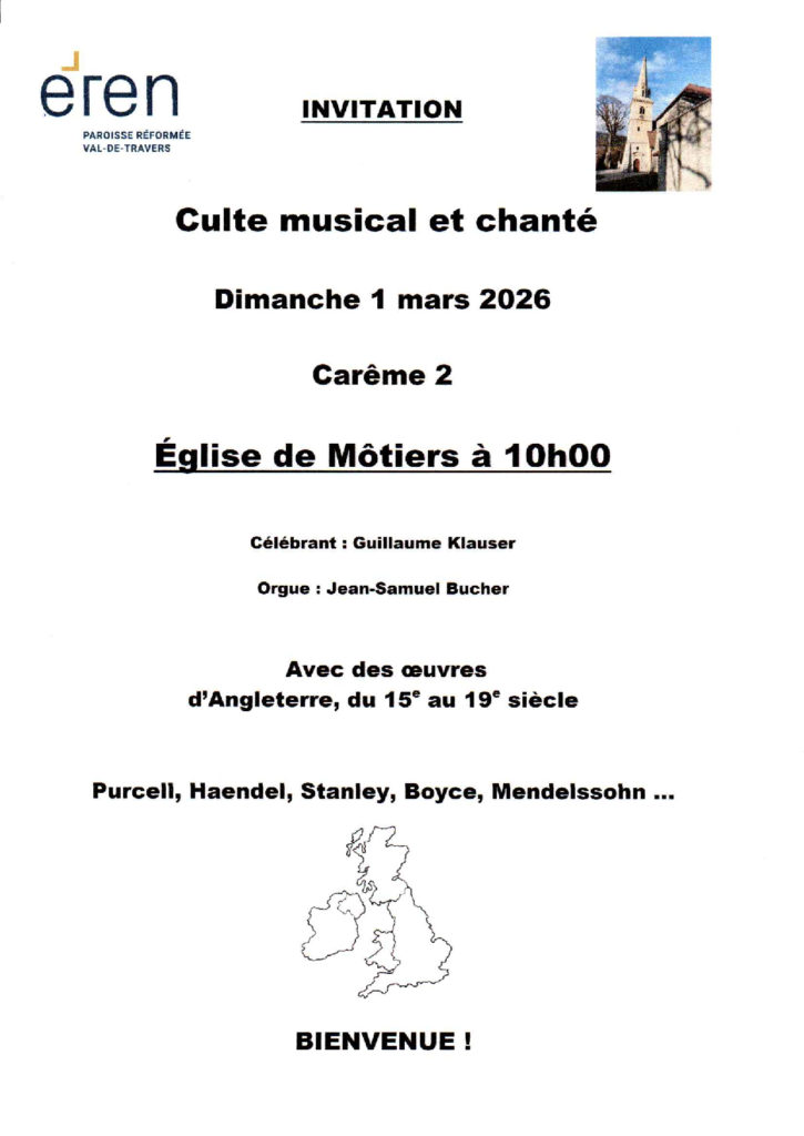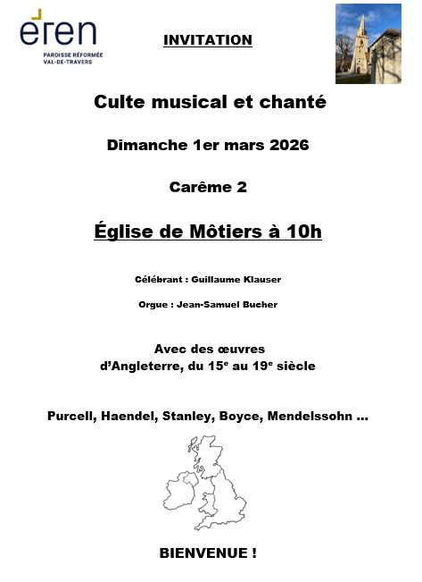 La paroisse protestante réformée du Val-de-Travers est une paroisse de l’EREN. Elle couvre les communes de Val-de-Travers, de La Côte-aux-Fées et des Verrières. Elle est un lieu d’ouverture, qui souhaite offrir aux habitant·e·s et aux gens de passage un espace à la rencontre de Dieu et des autres, dans la liberté. Bienvenue !